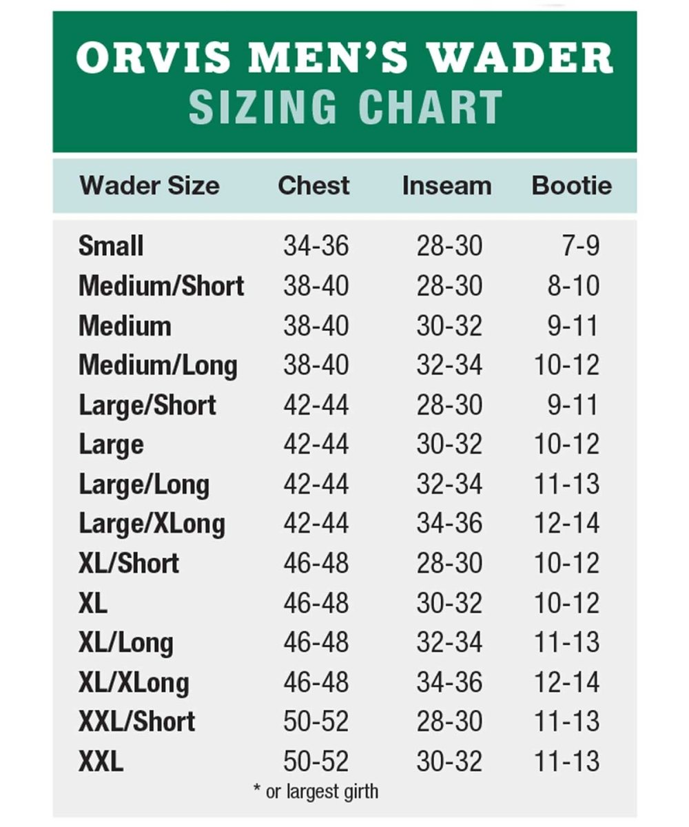 | Wader Size | Chest* | Pant Inseam up to: | Bootie Range (US Sizing) |