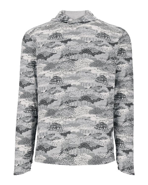 Built with Simms highest performing solar protective knit fabric (UPF50) that feels smooth to the touch, stretches for comfort, breathable, dries fast and keeps you odor-free with HeiQ Fresh and HeiQ Stain Away, PLUS InsectShield for long-lasting relief from biting insects. 3-panel hood designed to shield from the sun and stay on with a stretch binding and snap closure. Extended sleeve length with envelope thumbholes and a center finger loop for back-of-hand sun protection. Combination of marrow seams; flat-seam construction for maximum comfort and unrestricted movement. SIZES: S(chest 36"-38"), M(39-41), L(42-44), XL(46-48), XXL(49-51), 3XL(52-54).