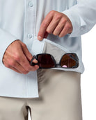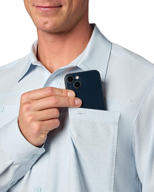 Meet the ultimate travel shirt. Enjoy your trip from plane to pier, on the water, or out to lunch, with a tech fabric and features that combine performance with a casual feel and crisp look. Built with a lightweight polyester heather woven fabric that stretches with you, dries fast, and travels well. Classic point collar for a crisp look and casual feel, center back locker loop, and button-front closure. Convenient sunglasses chamois located on the front hem. Chest pockets constructed with drop-in button closure. Left chest pocket has a bonus hidden zippered pocket and sunglass/pen stasher with bartack reinforcements. Placketed button sleeve cuff closure. Straight hem with side vents for breathability. Available in Bimini-Blue-Heather or Willow-Heather. SIZES: S(chest 36"-38"), M(39-41), L(42-44), XL(46-48), XXL(49-51), 3XL(52-54).