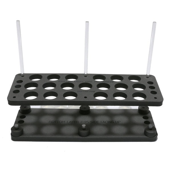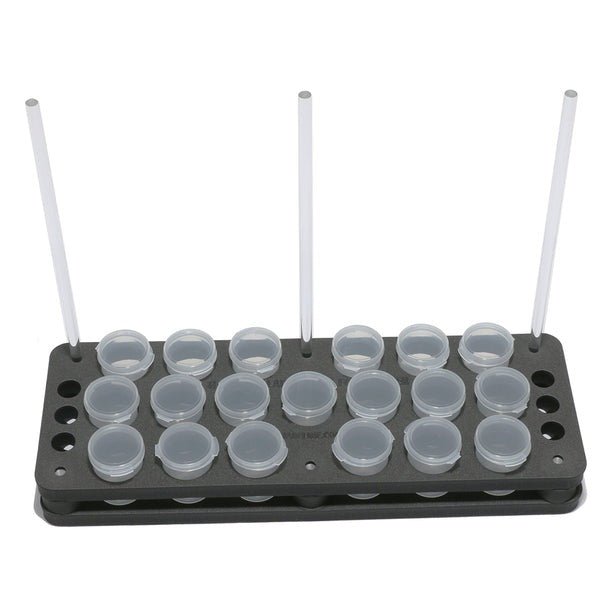 Each package includes two Foamanizer sections, 19 large round storage tubes with flip caps, six spacers, three long acrylic rods, and three short acrylic rods. The system is perfect for organizing materials such as dubbing, beads, and hooks. The long acrylic rods are especially useful for keeping thread, wire, and other spooled materials easily accessible.