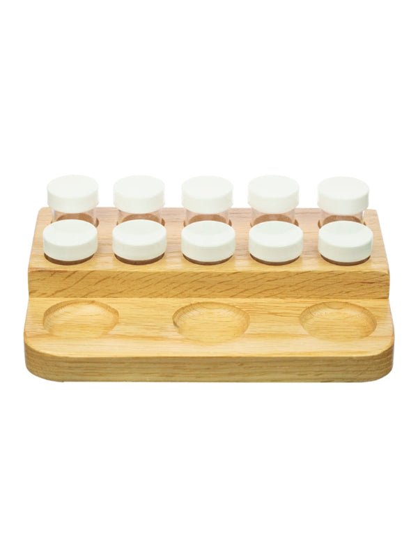 This is a real favorite. A beautiful red oak base (9" x 5-1/2") drilled out to hold 10-clear containers (included) for BEADS, BAR-BELL EYES, HOOKS and more. Clear containers have "white" screw-top lids. (Mark the lids for identification!) PLUS three "server-holes" are drilled into the lower front of the wood base. This allows us to dump the "beads" into the server-hole, and retrieve them one at a time while tying.