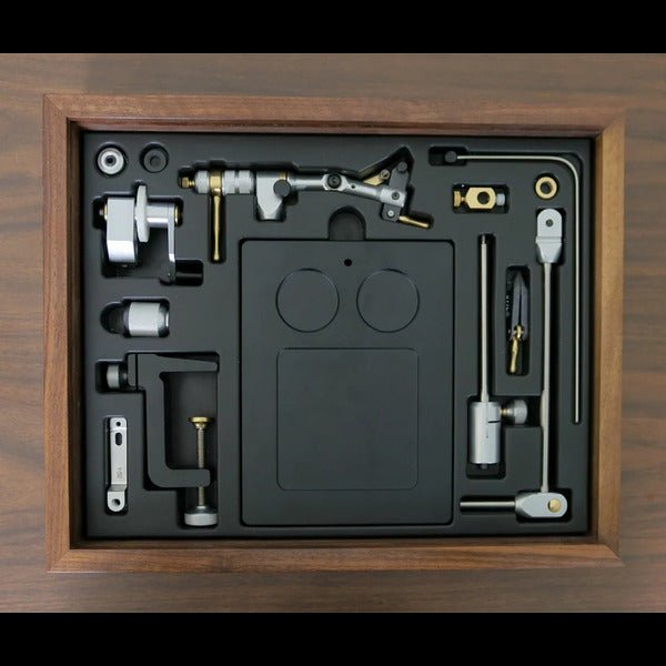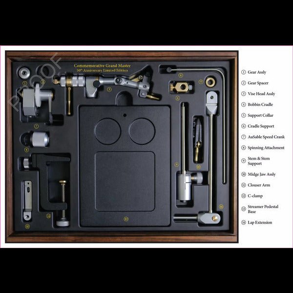 The Commemorative Grand Master Series is a collection of the iconic Master Vise. It is hand polished just like it was when introduced back in 1993 and incorporates a host of accessories many of which were inspired by input from luminaries like the late Lefty Kreh, Bob Popovics, Bob Clouser, David Whitlock, Nick Curcione, Blane Chocklett and Rusty Gates, to name just a few. There is a C-clamp lap extension, C-clamp, AuSable speed crank, spinning attachment, Clouser minnow arm, streamer pedestal bench, 3-inch stem extension, and midge jaws. All these components are encased in Garys elegant, handcrafted cigar-style wooden box signed by Andy with the 50th year anniversary logo lasered engraved on the lid. Only 100 of these are being made