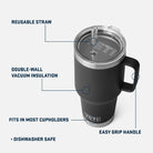 Built to house 35 oz. of your favorite cold beverages, this is one hefty hydrator. Supremely insulated and made with an elevated hand and a cup holder compatible design, it goes best with overly large cold brews, cross-country trips, and absolutely massive mocktails. And with our fan-favorite Straw Lid, you can say goodbye to single-use plastic straws. Our Rambler Drinkware and Lids are built to last, shatter-resistant and BPA-free. The Straw Lid has a molded-in stopper so your straw stays safely in place. Additionally, this mug is compatible with the Yeti MagSlider Lid. Made with kitchen-grade stainless steel so they are puncture and rust-resistant Double-wall vacuum insulation keeps drinks cold on even the hottest days Dishwasher safe because no one needs more work to do