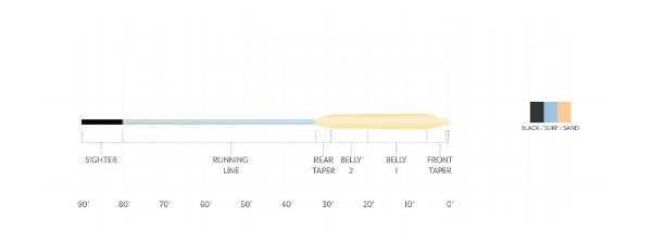 Built one size heavy to load quickly and deliver the biggest flies to the furthest targets. High contrast sighter to identify the back of the line when fighting fish on long runs. Built on a 65lb core. Comes with a 100lb braided add on. Designed for tropical environments. Color is Black/Surf/Sand. WF11F thru WF12F.