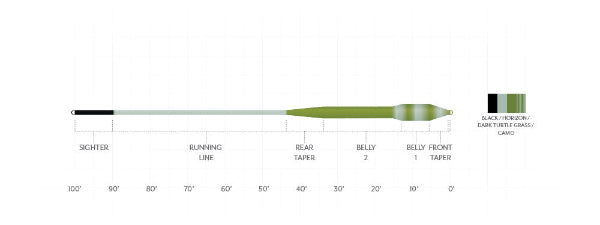Two size heavy line. Powerful head loads quickly and delivers large flies to distant targets. Ideal for tarpon, permit, snook and redfish. Core remains stiff in tropical environments. High contrast sighter to identify the back of the line when fighting fish on long runs. Color is Black/Horizon/Dk-Turtle-Grass/Camo.