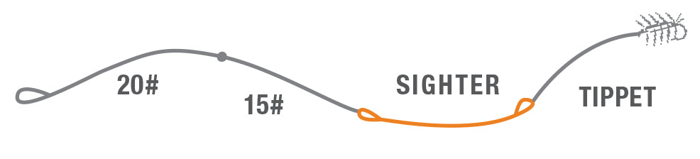 With the growth of European style nymphing here in the USA, these indicators (a.k.a. Sighters) have exploded in popularity. They are super sensitive and very easy to see, detecting even the slightest strike. There are two ways to use sighters. You can run them straight off the end of your fly line with a loop-to-loop connection followed by the leader, or you can build them into your own simple leader system. Here's one example (see illustration): Connect 36" of 20lb mono to 18" or 15lb mono with a uni-jam knot, then tie a small perfection loop at each end of the leader butt-section that you just created. Next, attach the Sighter loop-to-loop to the 15lb end of the butt-section, and attach your tipper (up to 4-feet) to the loop at the other end of the Sighter. You can find lots of different formulas online for Czech, Spanish, and French leaders. I like to keep the overall length of the leader a little bit shorter than the rod I am using. Sighters are 12" long. Every one hand made right here in Saint Louis.